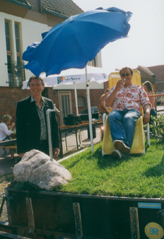 Gartenanhänger: Rainer Ecke, Karlsruhe Der "Gartenanhänger" bebildert verschiedene Wünsche von Stadtbewohnern. Zum Einen den Wunsch nach Mobilität der sich mit dem Wunsch nach Parkplätzen in zentraler Lage, bzw. vor der Haustüre verbindet. Zum Anderen den Wunsch nach Naturerlebnissen, der durch die Fahrt ins Grüne oder die Gestaltung künstlicher Landschaften als öffentliche und private Gärten befriedigt wird. Der Gartenhänger verbindet diese sich oft widersprechenden Vorstellungen in einer fragwürdigen Idylle. Allzeitbereit für die Fahrt in die Ferne, beinhaltet er doch schon vieles von dem was wir suchen könnten. Ein blauer Himmel, das Faulenzen in der Sonne, ein Wasser, das aus einem Felsen, entspringt und falls wir jetzt noch jemanden finden, der uns Cocktails serviert müsste unser Glück doch vollkommen sein. Bei der Betrachtung dieser "Erfüllung" stellen sich aber eher Fragen. Will man sich hier setzen, um in der Sonne zu entspannen oder fährt der Besitzer damit raus ins Grüne? Ist das eine Art privater Balkon oder darf ich das auch nutzen? Kann es wahr sein, dass hier jemand den wertvollen Parkplatz nutzt, um seinen Garten abzustellen? Wer erlaubt eigentlich dass hier dieses ganze Zeug abgestellt wird? Macht dass unsere Stadt bunter und schöner? |