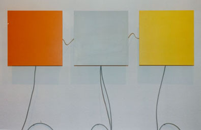 Interaktives Wandobjekt, bei dem der Betrachter und Zuhörer bestimmten Farben ihm jeweils passend erscheinende Klangfarben zuordnen kann. (1995) |