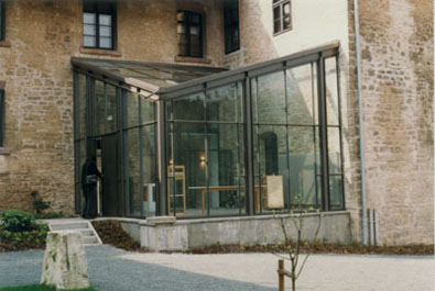 Wie ein Spinnennetz durchspannte ein Gebilde aus kleinen Lautsprechern und schwarzen Verbindungsfäden den warteraumähnlichen Vorraum zum Kloster Brunshausen. Geräusche öffentlichen Verkehrs durchkreuzten akustisch diese Räumlichkeiten. (1993) |