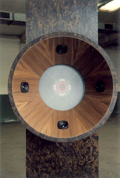 Ein Objekt für öffentliche Innenplätze. Der Besucher wird aufgefordert, eine Nachricht in den Empfängertrichter zu sprechen. Diese "hinterlegten" Nachrichten werden zeitverzögert, unregelmäßig wiederholend vom Sendetrichter ausgestrahlt. (2000) |